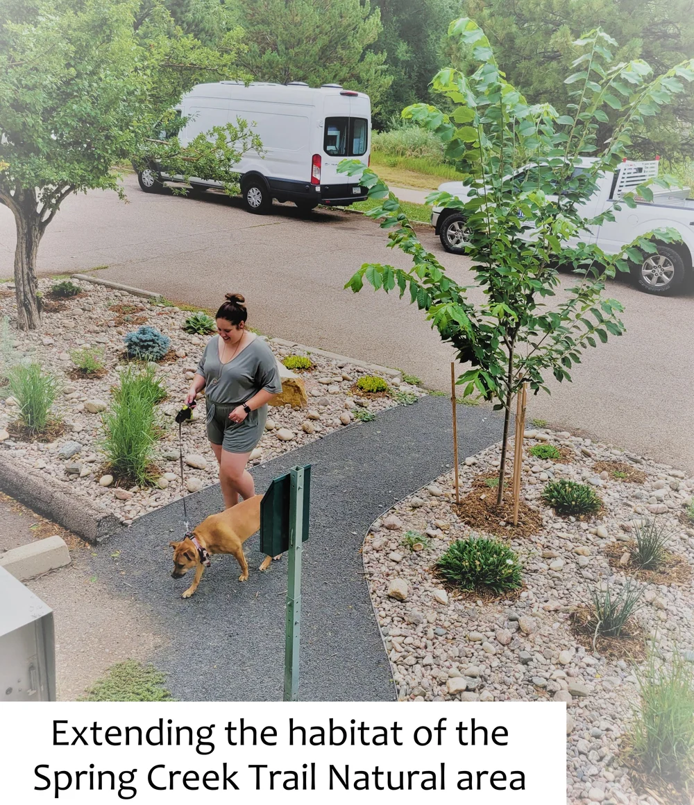 The Georgetown Gardens were constructed as an HOA Demonstration Garden. The project showcased a combination of xeriscaping and permaculture design principles aimed at solving the HOA community goals: increase resident benefit, cut resource use, increase building longevity, and build community through gardening. The project consisted of converting 11,000SF of the original 1979 turf grass landscape to diverse xeric gardens. A full sprinkler replacement – designed in conjunction with the new landscape and to maximize water savings – was also installed. The Gardens have an extensive plant list, more than 400 water wise plants across 90 species, were planted. With Spring Creek babbling just 50 yards to the south, the gardens and plant selections have reclaimed pollinator and bird habitat by essentially widening the natural area and wildlife corridor. The gardens also provide herb and food production for residents and have added shadow planted trees to increase the forest understory. Finally, pathways for enhanced circulation and two community gathering spaces were added.